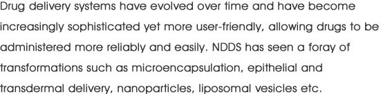 Drug delivery systems have evolved over time and have become increasingly sophisticated yet more user-friendly, allowing drugs to be administered more reliably and easily. NDDS has seen a foray of transformations such as microencapsulation, epithelial and transdermal delivery, nanoparticles, liposomal vesicles etc.